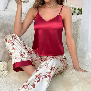 Laat je nachtrust samenvloeien met luxe dankzij deze satijnen pyjama set. De diepe wijnrode top gecombineerd met romantisch gebloemde satijnen broek maakt van jouw avonden een stijlvol ritueel.